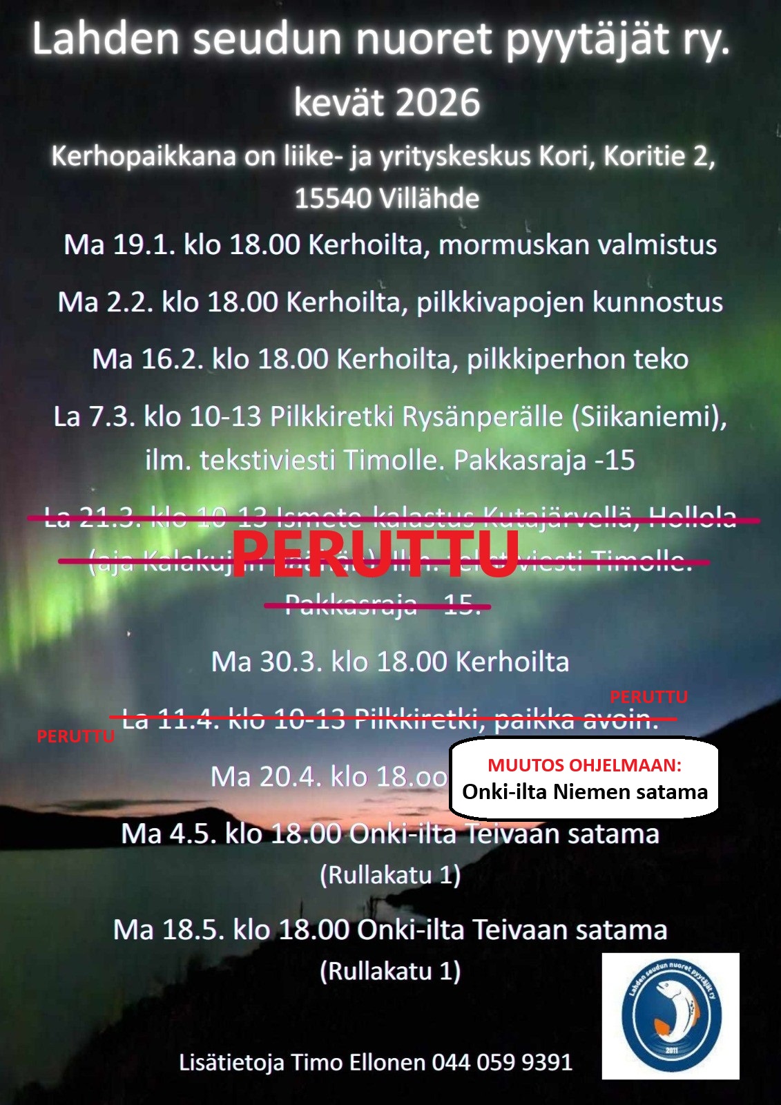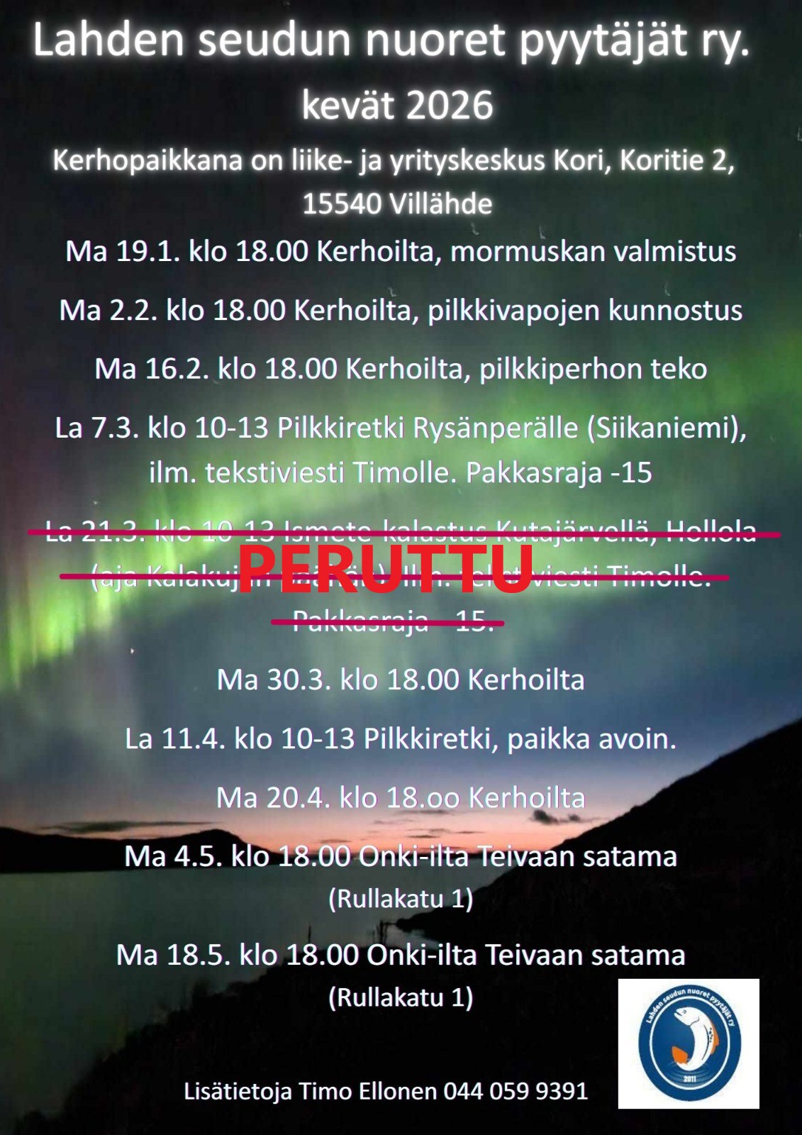 Huom! Omat pelastusliivit, kalastusvälineet lautoilla. Seuran jäsenille maksuton.